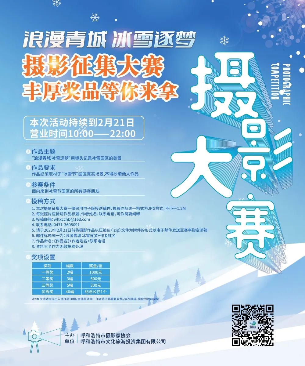 大黑河軍事公園2023呼和浩特冰雪節(jié)為感謝前來參觀的游客朋友,由呼和浩特市攝影家協(xié)會(huì)、呼和浩特市文化旅游投資集團(tuán)有限公司主辦的“浪漫青城 冰雪逐夢(mèng)”攝影征集大賽,面向廣大游客和攝影愛好者征集攝影作品,全面呈現(xiàn)你眼中的冰雪世界,通過手中的鏡頭真實(shí)地反映出大自然給予我們的浪漫驚喜。歡迎廣大游客朋友踴躍參與,豐厚大獎(jiǎng)等您拿!