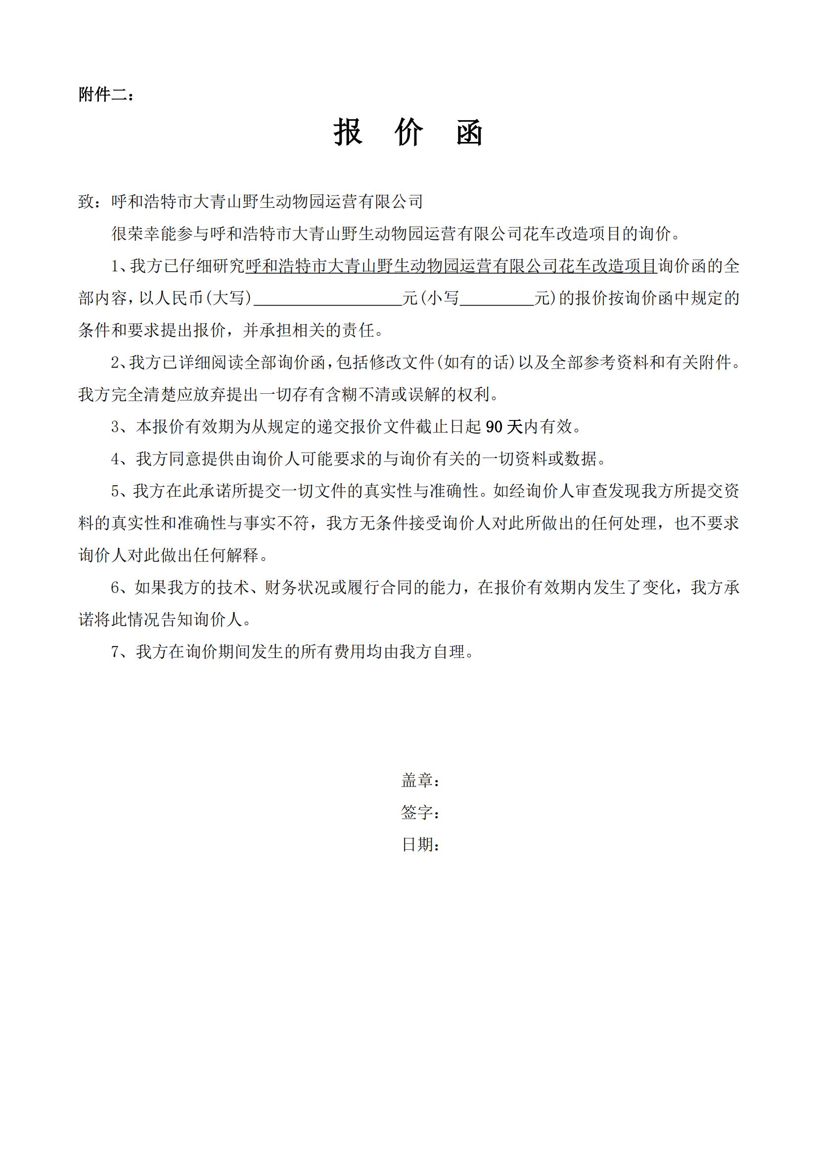 ? ? 一、詢價項目名稱:呼和浩特市大青山野生動物園運營有限公司花車改造項目