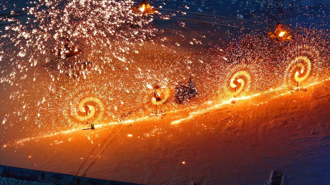 開(kāi)幕式當(dāng)晚,跨年活動(dòng)將節(jié)日氛圍推向高潮。自16時(shí)30分起,電音律動(dòng)、搖滾酣唱、互動(dòng)游戲接連登場(chǎng),千年非遺絕技“打鐵花”率先點(diǎn)亮蒼穹,鐵水潑灑如星雨紛落,繪就一幅“火樹(shù)銀花不夜天”的壯麗畫(huà)卷。20時(shí)整,開(kāi)幕式在煙花、極光與漫天花雪中正式啟動(dòng),祥瑞“鰲魚(yú)”凌空巡游,與激昂舞姿交織成夢(mèng)幻場(chǎng)景。